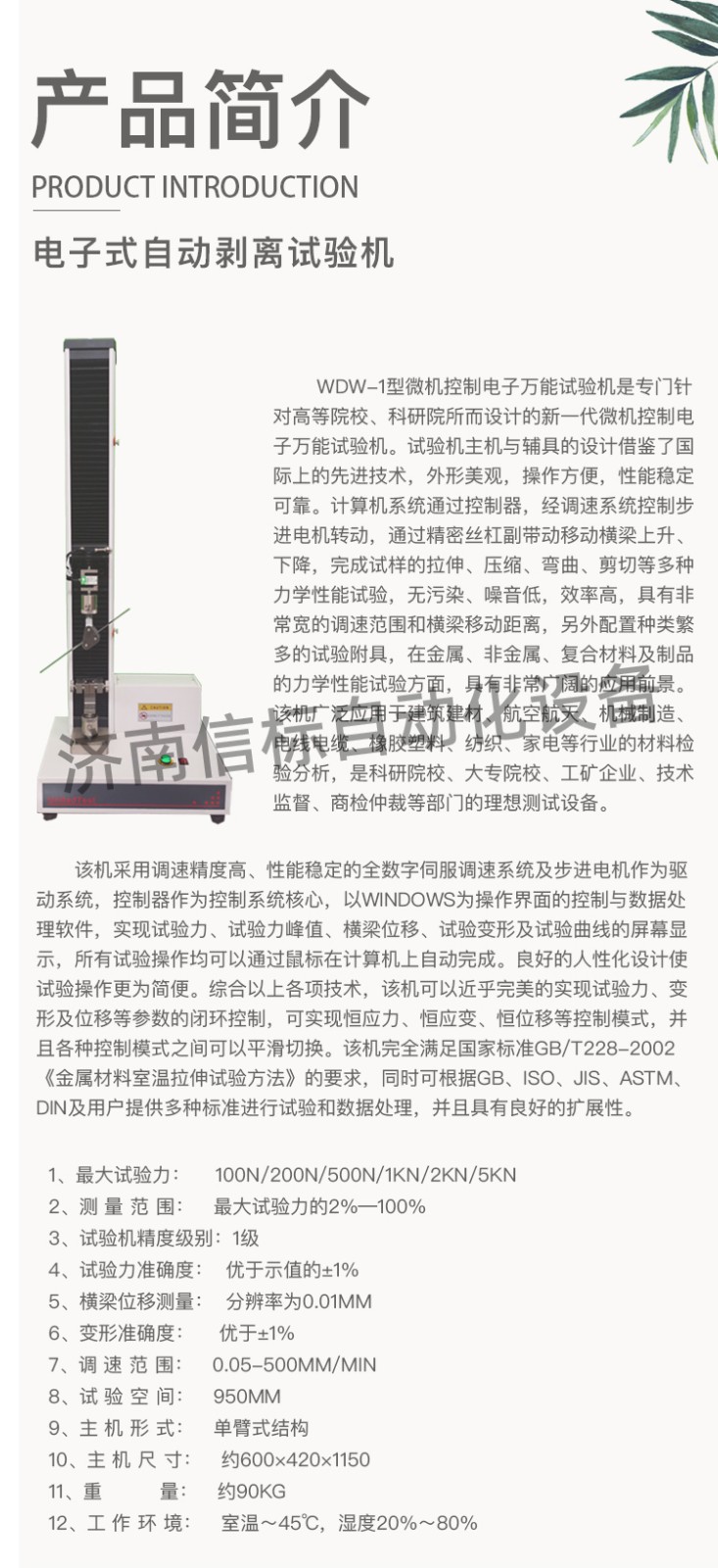 高強(qiáng)度膠黏劑膠帶浮棍法90度180度剝離強(qiáng)度試驗(yàn)機(jī)主要技術(shù)指標(biāo): 1、最大試驗(yàn)力: 100N/200N/500N/1KN/2KN/5KN 2、測 量 范 圍: 最大試驗(yàn)力的2%—100% 3、試驗(yàn)機(jī)精度級別:1級 4、試驗(yàn)力準(zhǔn)確度: 優(yōu)于示值的±1% 5、橫梁位移測量: 分辨率為0.01mm 6、變形準(zhǔn)確度: 優(yōu)于±1% 7、調(diào) 速 范 圍: 0.05-500mm/min 8、試 驗(yàn) 空 間: 950mm 9、主 機(jī) 形 式: 單臂式結(jié)構(gòu) 10、主 機(jī) 尺 寸: 約600×420×1150 11、重 量: 約90Kg 12、工 作 環(huán) 境: 室溫~45℃,濕度20%~80%
