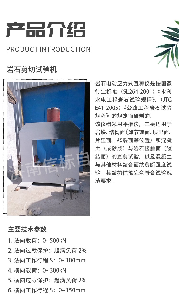 主要技術(shù)參數(shù): ?法向載荷:0~500kN ?法向過載保護:超滿負荷2% ?法向工作行程S:0~100mm ?橫向載荷:0~300kN ?橫向過載保護:超滿負荷2% ?橫向工作行程S:0~150mm ?法向空間 : ≤450mm ?橫向空間 : ≤200mm ?剪切載荷速度:0~30KN/S(可調(diào)) ?載荷指示方式:微機屏顯 ?載荷指示精度:0.1KN ?位移測量:微機采集 ?加載方式: ?法向:微機控制電液伺服閥門(也可手動進行); ?橫向:手動液壓閥; ?聯(lián)想電腦一臺(CL E3400 1G DDR2 160G DVD 19”液晶) ?HP噴墨打印機一臺 ?電機功率:1kW+1kW ?工作電壓:三相四線制 380V 50Hz(三火一零) ?整機重量:2200kg ?外形尺寸:1500×900×1735mm Equipment working conditions設備工作條件: 1.Power supply(電源):Three phase and Four wire(三相四線制); three live wire, one zero line(三火線一零線) 2.Wiring definition(接線定義):Brown - live wire, Yellow - live wire, Blue - live wire,Black – zero line 棕-火線,黃-火線,藍-火線,黑-零線; 3.Main motor power(主機功率):2.2kW(千瓦) Total; 4.Max . Normal load (最大法向力):500kN(千牛); 5.Max. Lateral load(最大橫向/剪切力):300kN(千牛); 6.hydraulic oil(液壓油):46# Hydraulic Oil@cold area or season; 68# Hydraulic Oil@hot area or season; 46#抗磨液壓油@寒冷地區(qū)或季節(jié);68#抗磨液壓油@炎熱地區(qū)或季節(jié); oil bearing(耗油量):40L(公升); 7.Weight of machine(主機重量):about 2000kg;約2噸; 8.在無震動環(huán)境中。 9.電源電壓波動范圍小于額定電壓的±10%。 10.地基應平整、牢固。 試機: 1.加油:油液采用46#號抗磨液壓油,加油孔在儀器左后方,將左后方蓋板打開,將油箱上方加油口保護罩打開,加油即可,油量在40L左右。 2.接電:請牢固連接三相電源,不可缺相。