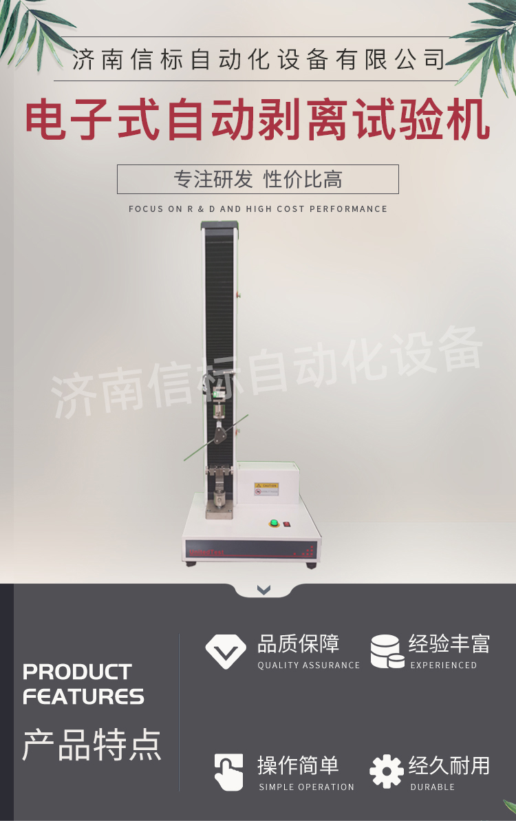 高強度膠黏劑膠帶浮棍法90度180度剝離強度試驗機主要功能及特點: 1、主機: 1.1調速系統采用伺服電機和自主研發減速系統,性能穩定可靠,具有過流、過壓、過載等保護裝置。調速范圍可達0.05~500mm/min。 1.2傳動部分采用圓弧同步齒形帶,精密絲杠副傳動,傳動平穩,噪音低,傳動效率高。 1.3萬向節采用十字插銷結構,而且具有擺角限制功能,一方面便于試樣夾持,保證試驗同心度,另一方面很好的消除了不規則試樣對傳感器的影響。 2、控制系統、操作軟件及數據處理系統 2.1計算機控制系統,具有集成度高、性能穩定、調整方便等優點。可以對實驗數據進行實時采集,對實驗特性曲線實現實時動態顯示,試驗數據文件能以Access常用數據庫或SQLserve大型數據庫的方式保存,方便實現客戶的資源共享及網絡管理,以及用戶的再分析。對于用戶自定義的各種word2000報表,該軟件可輕松實現訪問,解決了不同用戶或同一用戶在不同時期對試驗報表有不同需要的難題。該軟件可處理試驗力、位移、時間、變形的原始數據及由此派生的曲線。
