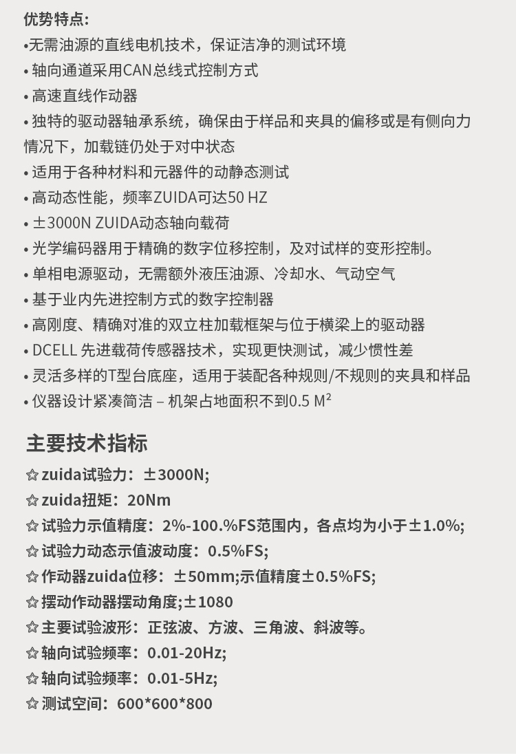 該試驗系統(tǒng),既能進行動態(tài)的高、低周疲勞試驗、程序控制疲勞試驗,也能進行靜態(tài)的恒速率、恒應(yīng)變、恒應(yīng)力控制下的試驗和各種常規(guī)的力學性能試驗,還可進行斷裂力學試驗,也可以對廣義范圍上材料或構(gòu)件的疲勞壽命、裂紋擴展、斷裂韌性性能測試、實際試件的安全性評價、工況模擬等,因此有著其它任何種類的試驗機所不能比擬的優(yōu)勢,是國際疲勞力學研究領(lǐng)域界最推崇的材料試驗設(shè)備。 由于該系統(tǒng)采用自適應(yīng)無間隙的電動伺服作動器,頻響速度快,噪音低,節(jié)能環(huán)保,非常適合企業(yè)和研究機構(gòu)對小零部件的研究測試! 2.優(yōu)勢特點: ?無需油源的直線電機技術(shù),保證潔凈的測試環(huán)境 ? 軸向通道采用Can總線式控制方式 ? 高速直線作動器 ? 獨特的驅(qū)動器軸承系統(tǒng),確保由于樣品和夾具的偏移或是有側(cè)向力情況下,加載鏈仍處于對中狀態(tài) ? 適用于各種材料和元器件的動靜態(tài)測試 ? 高動態(tài)性能,頻率zuida可達50 Hz ? ±3000N zuida動態(tài)軸向載荷 ? 光學編碼器用于精確的數(shù)字位移控制,及對試樣的變形控制。 ? 單相電源驅(qū)動,無需額外液壓油源、冷卻水、氣動空氣 ? 基于業(yè)內(nèi)先進控制方式的數(shù)字控制器 ? 高剛度、精確對準的雙立柱加載框架與位于橫梁上的驅(qū)動器 ? Dcell 先進載荷傳感器技術(shù),實現(xiàn)更快測試,減少慣性差 ? 靈活多樣的T型臺底座,適用于裝配各種規(guī)則/不規(guī)則的夾具和樣品