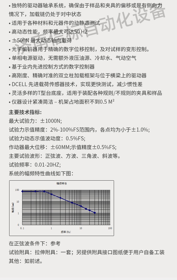 優勢特點: ?無需油源的直線電機技術,保證潔凈的測試環境 ? 軸向通道采用Can總線式控制方式 ? 高速直線作動器 ? 獨特的驅動器軸承系統,確保由于樣品和夾具的偏移或是有側向力情況下,加載鏈仍處于對中狀態 ? 適用于各種材料和元器件的動靜態測試 ? 高動態性能,頻率最大可達50 Hz ? ±500N 最大動態軸向載荷 ? 光學編碼器用于精確的數字位移控制,及對試樣的變形控制。 ? 單相電源驅動,無需額外液壓油源、冷卻水、氣動空氣 ? 基于業內先進控制方式的數字控制器 ? 高剛度、精確對準的雙立柱加載框架與位于橫梁上的驅動器 ? Dcell 先進載荷傳感器技術,實現更快測試,減少慣性差 ? 靈活多樣的T型臺底座,適用于裝配各種規則/不規則的夾具和樣品 ? 儀器設計緊湊簡潔 – 機架占地面積不到0.5 m2 優勢特點: ?無需油源的直線電機技術,保證潔凈的測試環境 ? 軸向通道采用Can總線式控制方式 ? 高速直線作動器 ? 獨特的驅動器軸承系統,確保由于樣品和夾具的偏移或是有側向力情況下,加載鏈仍處于對中狀態 ? 適用于各種材料和元器件的動靜態測試 ? 高動態性能,頻率最大可達50 Hz ? ±500N 最大動態軸向載荷 ? 光學編碼器用于精確的數字位移控制,及對試樣的變形控制。 ? 單相電源驅動,無需額外液壓油源、冷卻水、氣動空氣 ? 基于業內先進控制方式的數字控制器 ? 高剛度、精確對準的雙立柱加載框架與位于橫梁上的驅動器 ? Dcell 先進載荷傳感器技術,實現更快測試,減少慣性差 ? 靈活多樣的T型臺底座,適用于裝配各種規則/不規則的夾具和樣品 ? 儀器設計緊湊簡潔 – 機架占地面積不到0.5 m2