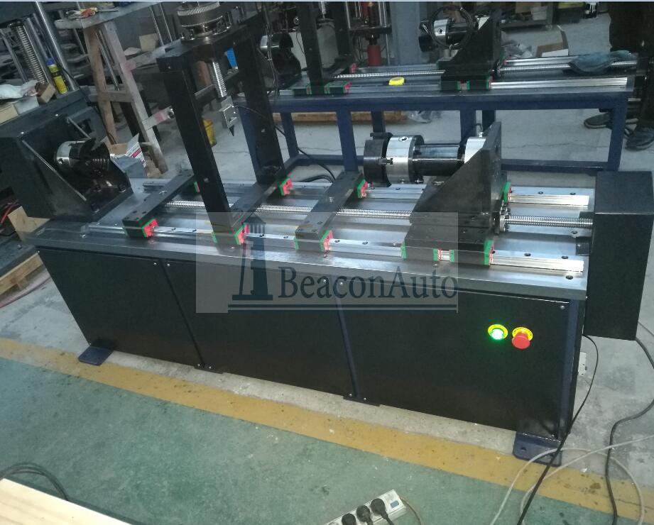 貫流風(fēng)葉旋轉(zhuǎn)試驗(yàn)臺主要技術(shù)指標(biāo) 試驗(yàn)及級別:1級 最大拉伸試驗(yàn)力: 10000N 最大試驗(yàn)扭矩: 50 Nm 最大徑向試驗(yàn)力: 500N 位移最小讀數(shù):0.01mm 位移最大讀數(shù):600.00mm 角位移最大讀數(shù):999.99度 角位移最小讀數(shù):0.1度 最大行程:1200mm 電源:220V 50Hz 扭轉(zhuǎn)部分: 1.貫流風(fēng)葉旋轉(zhuǎn)試驗(yàn)臺項(xiàng)目簡介 扭轉(zhuǎn)部分是由加載系統(tǒng)、傳動系統(tǒng)、數(shù)字式數(shù)據(jù)采集處理系統(tǒng)及計(jì)算機(jī)測量控制顯示系統(tǒng)等組成,適用于對軸流風(fēng)扇靜態(tài)扭轉(zhuǎn)力學(xué)的性能測試。該機(jī)采用落地臥式結(jié)構(gòu)。計(jì)算機(jī)屏幕顯示,數(shù)字式數(shù)據(jù)采集控制系統(tǒng)和全數(shù)字交流伺服系統(tǒng)組成閉環(huán)控制。采用行星擺線針輪減速器傳動,具有加載均勻、穩(wěn)定、無沖擊現(xiàn)象、數(shù)據(jù)采集控制準(zhǔn)確的特點(diǎn)。 試驗(yàn)測試功能:Win2000/XP中文操作平臺。使用以圖形為界面的視窗式操作系統(tǒng),可設(shè)定顯示屏幕及操作面板;可設(shè)定試驗(yàn)速度及各種控制參數(shù);可實(shí)時顯示基本試驗(yàn)結(jié)果(斷裂值、峰值);可實(shí)時顯示試驗(yàn)過程各種相關(guān)參數(shù)圖形;可實(shí)現(xiàn)系統(tǒng)診斷并顯示診斷結(jié)果。試驗(yàn)機(jī)實(shí)現(xiàn)分級管理權(quán)限。不同的用戶可進(jìn)入不同的管理界面、分三級用戶管理權(quán)限。 整機(jī)利用全數(shù)字交流伺服控制系統(tǒng)及數(shù)字式數(shù)據(jù)采集處理系統(tǒng),光電編碼器采集試樣的扭轉(zhuǎn)角度。 2.目的: 軸流風(fēng)扇的靜態(tài)扭轉(zhuǎn)實(shí)驗(yàn) 3.方案描述 【主 機(jī)】采用臥式結(jié)構(gòu),主體結(jié)構(gòu)采用焊接結(jié)構(gòu),以保證整機(jī)的剛性。夾具采用優(yōu)質(zhì)合金結(jié)構(gòu)鋼40CrNiMoA淬火(HRC45~50)方式,主傳動軸采用優(yōu)質(zhì)合金結(jié)構(gòu)鋼淬火處理,保證其使用壽命。試樣的安裝、拆卸方便、快捷。 【驅(qū)動系統(tǒng)】由全數(shù)字交流伺服控制系統(tǒng)驅(qū)動。速度調(diào)節(jié)范圍寬,加載均勻、穩(wěn)定。 【傳動系統(tǒng)】采用行星擺線針輪減速器傳動,保證傳動的均勻、穩(wěn)定及傳動精度。縱向空間可以根據(jù)汽車半軸的規(guī)格進(jìn)行調(diào)整,橫向空間根據(jù)驅(qū)動橋的規(guī)格任意手動調(diào)節(jié)。 【測量顯示系統(tǒng)】該機(jī)采用光電編碼器采集試樣的扭轉(zhuǎn)角度,高精度扭矩傳感器采集試樣的扭矩。計(jì)算機(jī)屏幕顯示試樣的扭矩、扭轉(zhuǎn)角度、扭轉(zhuǎn)剛度以及各類曲線等。 【軟件操作】 ★控制模式采用智能專家設(shè)置系統(tǒng),用戶可以根據(jù)自己的實(shí)際要求編制試驗(yàn)過程控制方式,自動完成試驗(yàn)。 ★ Windows2000/XP全中文界面,人機(jī)對話方式。試驗(yàn)的全部操作均借助CRT,通過計(jì)算機(jī)鍵盤與鼠標(biāo)完成,計(jì)算機(jī)屏幕顯示試驗(yàn)扭矩T,扭轉(zhuǎn)角度θ,扭轉(zhuǎn)次數(shù),各種試驗(yàn)曲線(扭矩-時間曲線、扭矩-角度曲線、角度-時間曲線等)試驗(yàn)機(jī)工作狀態(tài)等。 ★曲線坐標(biāo)的大小可以根據(jù)實(shí)際的試驗(yàn)數(shù)據(jù)進(jìn)行調(diào)整。 ★輸出打印各種試驗(yàn)報(bào)表格式(報(bào)表格式可以Excel或Word格式輸出)。 ★符合JB/T9370—1999《扭轉(zhuǎn)試驗(yàn)機(jī)技術(shù)條件》及GB10128—88《金屬室溫扭轉(zhuǎn)試驗(yàn)方法》數(shù)據(jù)處理的相關(guān)要求。 ★可以設(shè)定以正弦波或方波的方式進(jìn)行循環(huán)加載。 ★ 試驗(yàn)過程可以實(shí)現(xiàn)模擬再現(xiàn)。 ★ 可以任意多條試驗(yàn)曲線疊加對比、輸出打印。 ★ 可以進(jìn)行數(shù)字化調(diào)零和標(biāo)定。 ★ 試驗(yàn)數(shù)據(jù)采用數(shù)據(jù)庫管理方式,便于查詢和維護(hù)。 ★ 軟件系統(tǒng)的操作可以實(shí)現(xiàn)三級用戶管理,安全、方便、快捷。 【安全保護(hù)系統(tǒng)】過載保護(hù)、過電流、過電壓保護(hù)、超速保護(hù)、工作值保護(hù)、行進(jìn)保護(hù)等。 4.貫流風(fēng)葉旋轉(zhuǎn)試驗(yàn)臺主要技術(shù)性能指標(biāo): 4. 1大輸出扭矩:±50Nm;測量范圍:±0.1~±50Nm 4. 2驗(yàn)扭矩示值相對誤差:±1% 4.3試驗(yàn)扭矩重復(fù)性相對示值誤差:≤1% 4.4扭矩測量范圍:1%~100% 4.5縱向空間:0~1200mm可調(diào) 4. 6轉(zhuǎn)角度分辯率:0.10; 4. 7加載方式:可以設(shè)定以一定速度或扭距進(jìn)行持續(xù)加載。 4. 8加載速度:0.005~3r/min任意設(shè)定 4. 9加載控制精度為:±2% 4. 10壓電壓:AC380V 50Hz 5.貫流風(fēng)葉旋轉(zhuǎn)試驗(yàn)臺功能要求: 5.1系統(tǒng)集成、加載、操作運(yùn)行控制由計(jì)算機(jī)控制,試驗(yàn)過程的數(shù)據(jù)采集、記錄由計(jì)算機(jī)完成,可以實(shí)現(xiàn)試驗(yàn)數(shù)據(jù)回放,報(bào)表輸出; 5.2加載量在設(shè)備性能指標(biāo)的范圍內(nèi)連續(xù)可調(diào)穩(wěn)定輸出; 5.3試驗(yàn)控制操作集中在控制臺(柜),采用單人坐式操作;試驗(yàn)件安裝調(diào)整符合操作人員立式操作的要求;試驗(yàn)工裝需要必要的旋轉(zhuǎn)功能,方便主減齒輪試驗(yàn)時主減速器的安裝、拆卸; 二軸向及徑